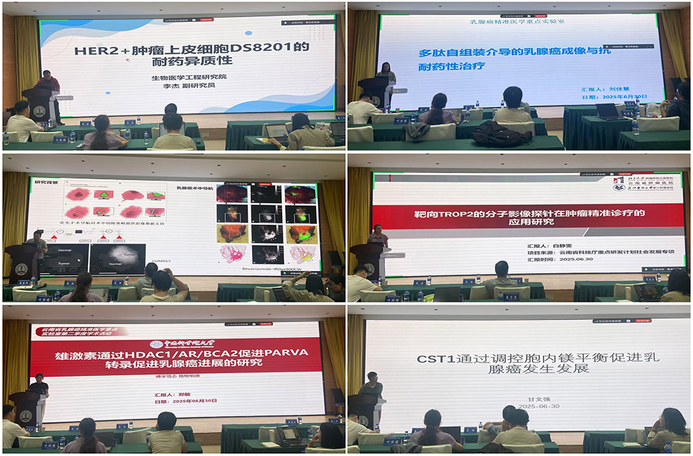 在PI分享汇报与学术论坛环节,李杰副研究员以“HER2+肿瘤上皮细胞DS8201的耐药异质性”为题,分享了团队利用生物信息学技术探究不同HER2+肿瘤对DS8201耐药机制的最新研究进展。刘佳慧、汤永嘉和白静雯分别围绕“多肽自组装介导的乳腺癌成像与耐药性治疗”、“Trop2靶向探针的设计筛选及应用”以及“靶向TROP2的分子影像探针在肿瘤精准诊疗的应用研究”作了精彩报告,系统介绍了以Trop2为靶点研发多肽类分子影像探针的最新成果。郑敏博士则介绍了雄激素通过HDAC1/AR/BCA2轴促进PARVA转录,进而促进雄激素受体阳性乳腺癌进展的相关研究;甘文强博士分享了CST1通过调控胞内镁离子平衡促进乳腺癌发生发展的机制。
