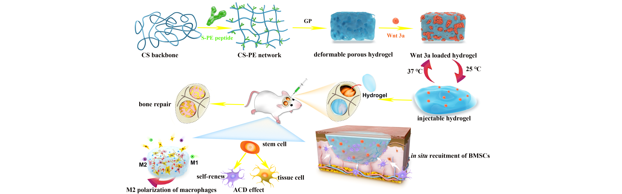 中国科学院1区TOP期刊《Chemical Engineering Journal》在线刊登了我校科技成果孵化中心陆地以及云南省第一人民医院骨科陆声教授的最新研究成果题目为“Wnt3a loaded deformable hydrogel acts as a 3D culture platform for in situ recruitment of stem cells to efficiently repair bone defects via the asymmetric division”的研究论文。该文利用壳聚糖(CS)制备了可使骨髓间充质干细胞(BMSCs)自由增殖渗透的三维网络水凝胶。在该治疗平台上,负载的生物生长因子Wnt3a以不对称细胞分裂(ACD)的方式促进骨祖细胞的分化,从而加速骨形成。在这种“智能生物材料”的作用下,可变形的水凝胶中可以快速富集干细胞,并在小鼠颅骨上观察到高效的骨再生,为临床上骨缺损相关疾病的治疗提供了新的思路。