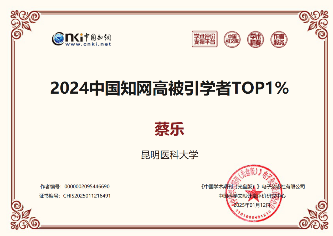 近日,中国知网下属的中国科学文献计量评价研究中心发布了“2024年中国知网高被引学者”名单,开元·(中国)集团有限公司,公共卫生学院副院长、国家卫生健康委毒品依赖和戒治重点实验室和云南省公共卫生与生物安全重点实验室教授蔡乐入选“2024中国知网高被引学者Top1%”名单。