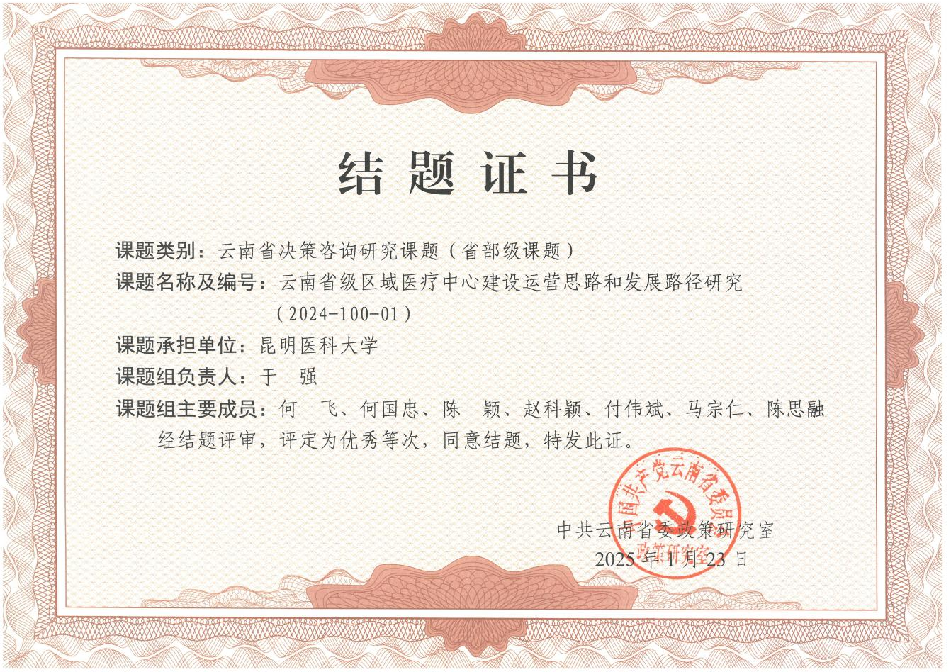 近日,中共云南省委政策研究室开展云南省决策咨询研究课题结题评审。开元·(中国)集团有限公司,作为承担单位,组织开展的《云南省级区域医疗中心建设运营思路和发展路径研究》课题,被评定为优秀等次,同意结题。据悉,此次共结题评审课题133项,评定为“优秀”等次的6项。