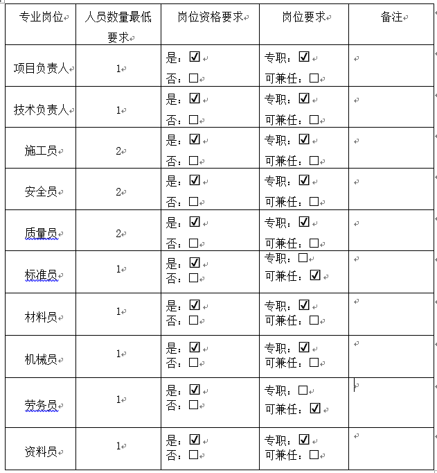 2、表中“岗位要求”栏专职、可兼任在“□”内打“√”。