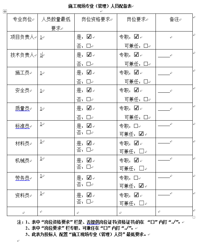 2、施工现场专业(管理)人员配备:施工现场专业(管理)人员配备不低于后附《施工现场专业(管理)人员配备表》。且施工现场专业(管理)人员必须为投标人本单位人员,需提供与投标人签订的有效劳动合同和关系在本单位的社保证明(社保证明提供期限要求:从 2025 年 01 月 01 日起提供任意 3 个月或以上),并提供无挂证行为承诺书。若存在挂证行为的,一经查实否决其投标或取消中标资格,并依法依规进行处罚。(证书有关情况可通过全国建筑市场监督公共服务平台 https://jzsc.mohurd.gov.cn/home,全国工程质量安全监管信息平台 https://zlaq.mohurd.gov.cn/,住房城乡建设行业人员培训管理信息系统 https://rcgz.mohurd.gov.cn./,各省市行业行政主管部门官方网站查询)。